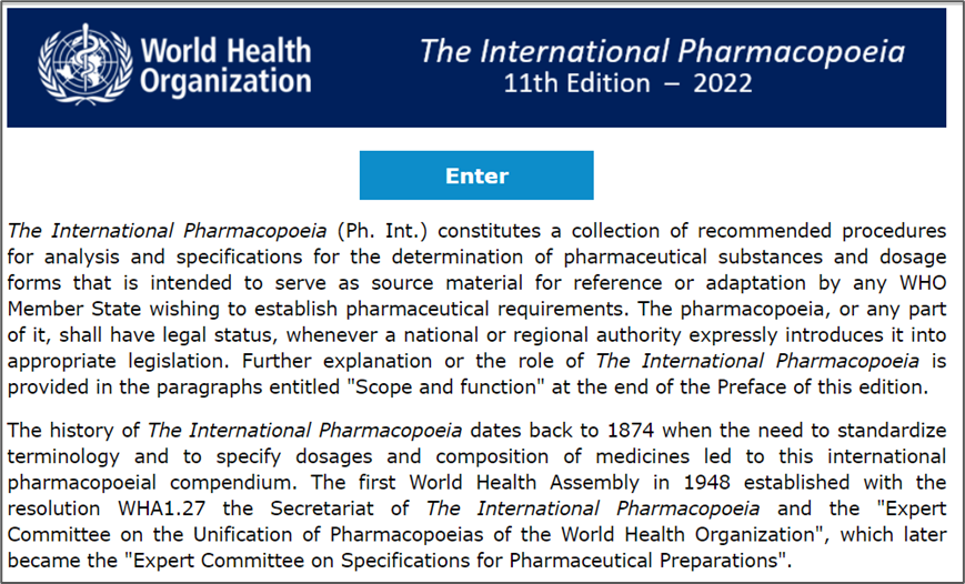 有国际卫生组织WHO负责协调和更新,进入主页后,点击search,进入药典的搜索界面,输入关键词就可以搜索相关信息。当前的版本是国际药典2022年第11版。