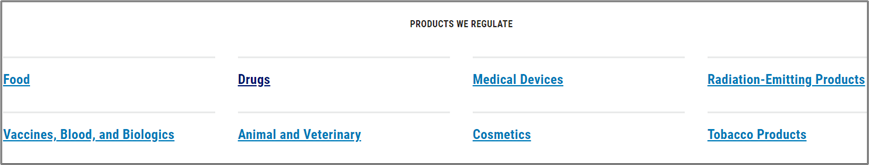 Drugs项下共8个模块内容:药物警戒、召回等安全性信息;药品批准情况和数据库;药品申报和审评流程;指南、合规性和监管信息;科学与研究工具、数据库等;应急准备,以应对自然灾害、恐怖组织等突状况;新的审评进展、新产品和新培训课程等(可下载);关于药品审评和研究中心的介绍,如职责、组织架构。