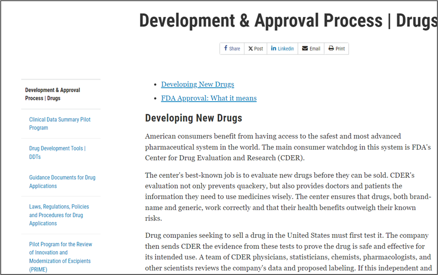 Drugs选项下的Development & Approval Process模块为注册申报提供了参考:首页详细介绍了药品的开发、申请和审批流程,以及审评要求,并介绍了三种特殊的申请路径——Fast Track(加速审评)、Breakthrough Therapy(突破性疗法)和Priority Review(优先审查),大大缩短了审评时间,有助于加速产品上市。此模块包括以下五项具体内容: