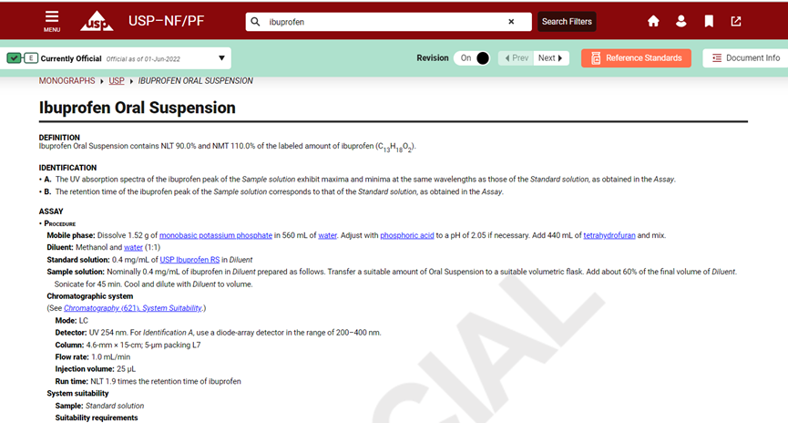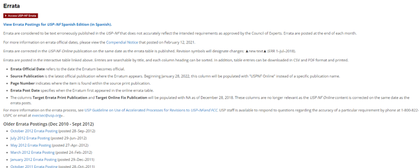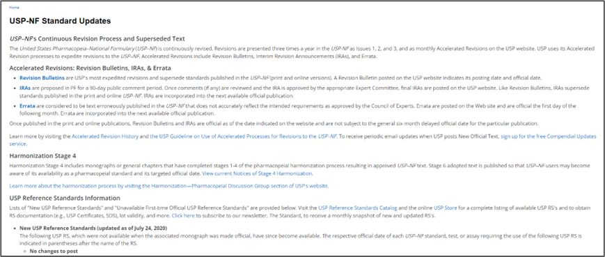 其中包含标准更新(USP-NF Standard Updates),修订公告(Revision Bulletins),临时修订声明(Interim Revision Announcements, IRAs),待审各论”(Pending Monographs),加速修订官方日期(Accelerated Revisions by Official Date),勘误表(Errata)等。