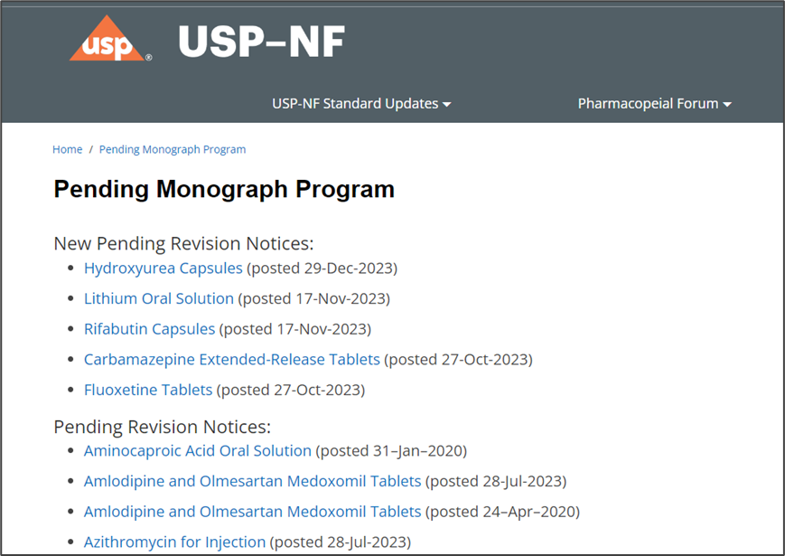 其中的各论品种均为已向FDA提交审请资料或拟提交资料的品种,但均还未取得FDA的上市批准。一旦获得FDA批准,FDA将与申请人一同推进该各论成为正式标准。新增或修订的待审各论每月更新一次,均在每月最后的一个周五。(“Received as Pending”该各论,还未升级为征求意见稿公布在USP网站;“Posted as Pending”已发布在USP的待审各论上,且可获得该各论全文)。